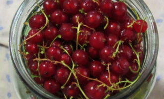 - Wanneer alle ingrediënten zijn voorbereid, beginnen we alle inhoud bij elkaar te verzamelen. Doe eerst de komkommers in de pot, druk ze stevig tegen elkaar, en bovenop de komkommers leggen we de takjes rode aalbessen en vullen de gaten op. En dus blijven we afwisselen en leggen we komkommers of bessen.