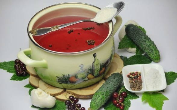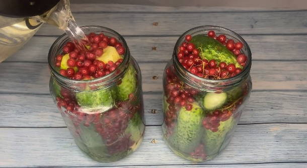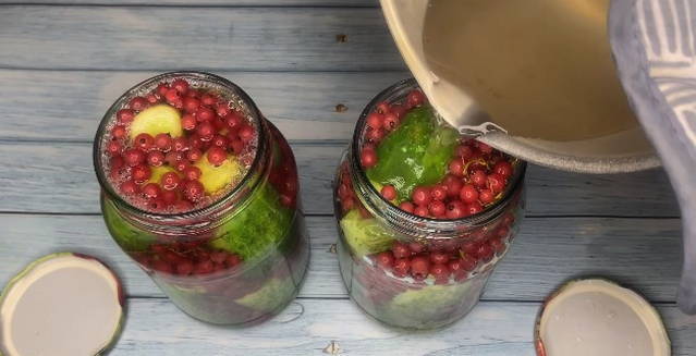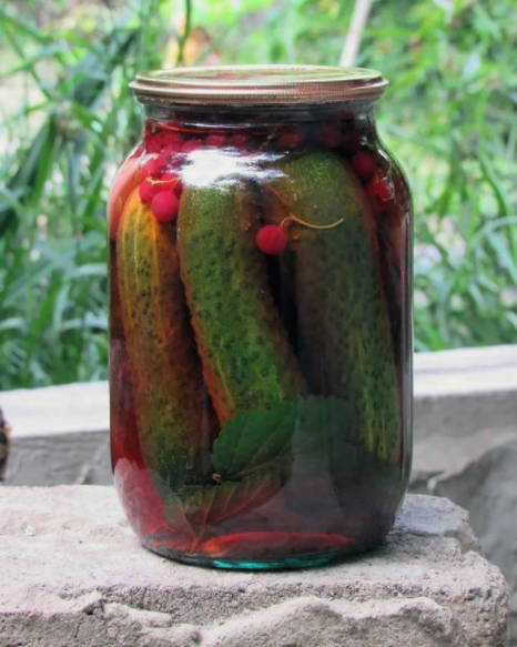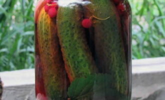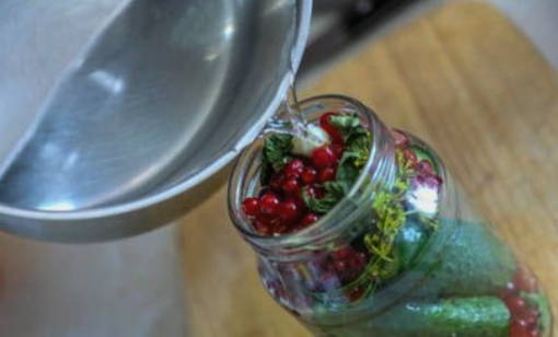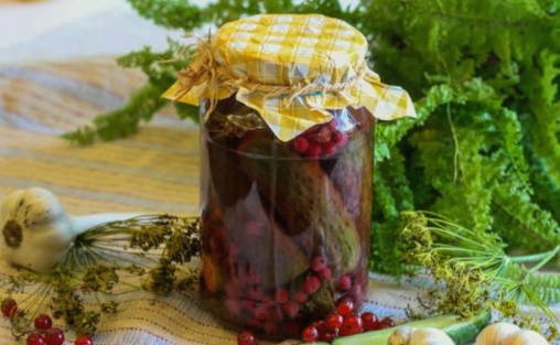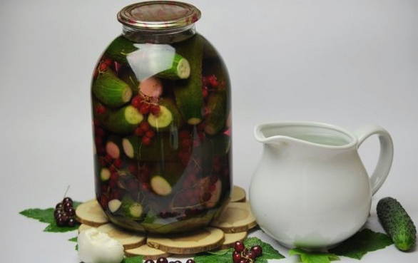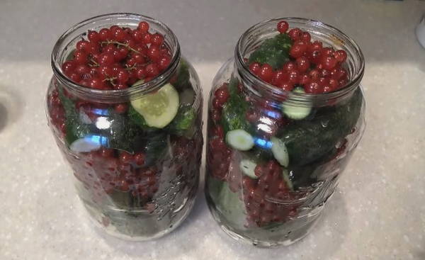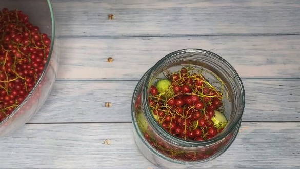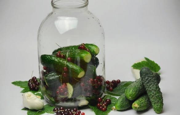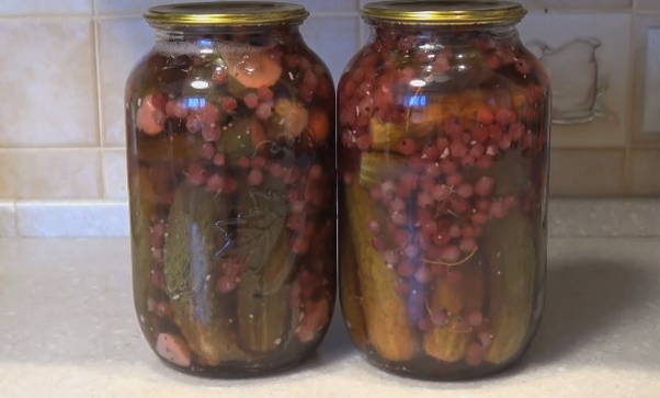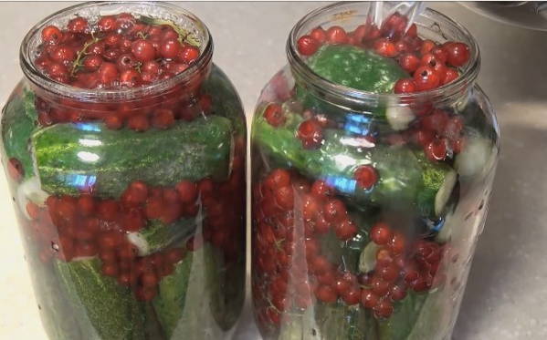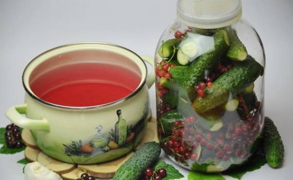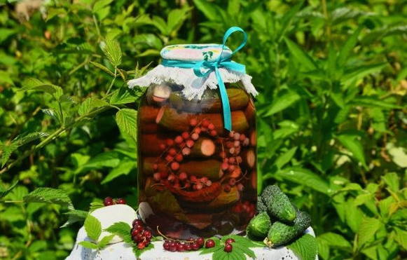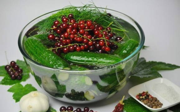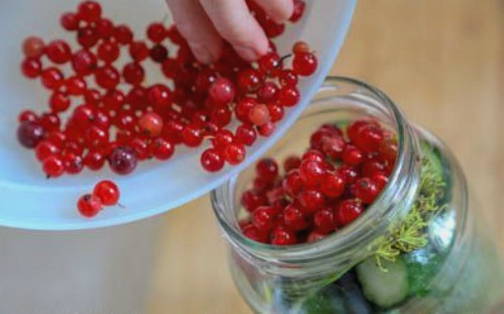 Ingelegde komkommers en rode aalbessen profiteren niet alleen vanwege hun spectaculaire uiterlijk, maar ook vanwege hun voordelen. Rode bes is immers een uitstekend bewaarmiddel dat azijn kan vervangen, de marinade een zuurheid en een aangename roze tint kan geven.