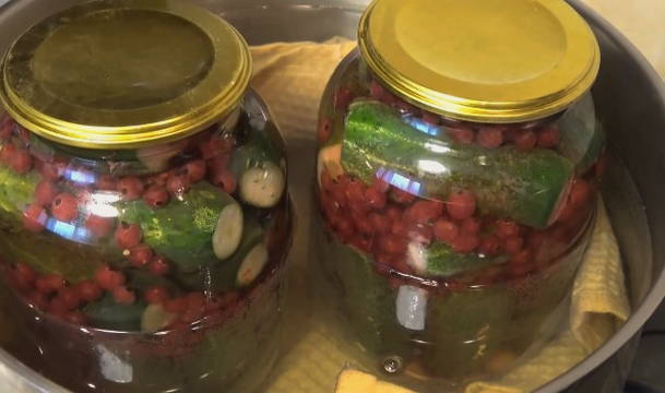 Komkommers met rode bessen zonder azijn voor de winter