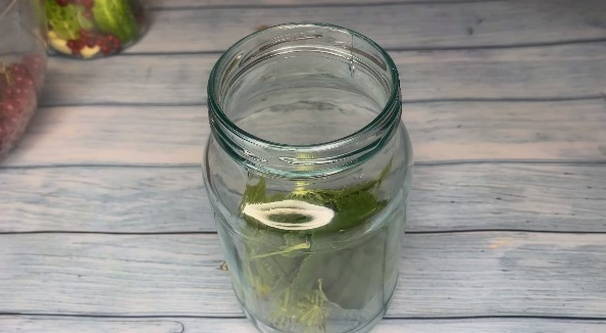 - Op de bodem van de pot gewassen met frisdrank, laten we de paraplu van dille, bessenbladeren, piment zakken.