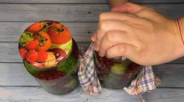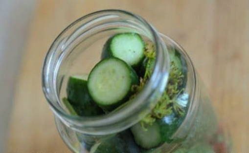 - Giet komkommers met kant-en-klare marinade, rol de pot op en draai hem ondersteboven. Bedek de omgekeerde pot met een deken en laat afkoelen tot kamertemperatuur.