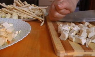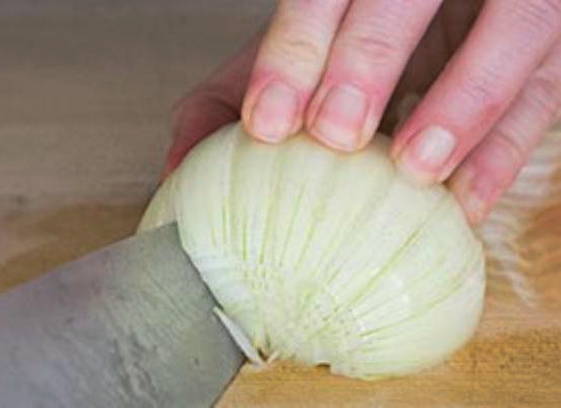 - Hak de ui grof, hak de mierikswortel fijn, pel de knoflook en laat de teentjes heel.