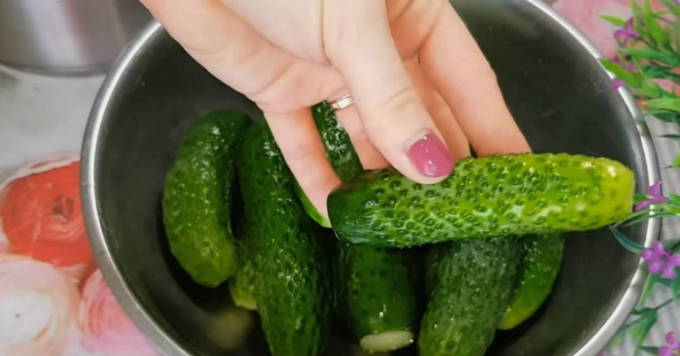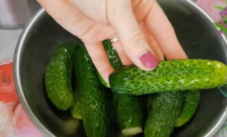 - Giet komkommers met koud water en laat 3-4 uur staan, snij dan de staarten van elk af.