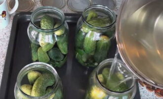 - Vul de potten met komkommers zodat ze goed op elkaar passen. Giet kokend water over de groenten en laat 10 minuten trekken. Tap het water af en herhaal de procedure opnieuw.