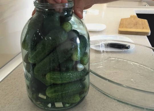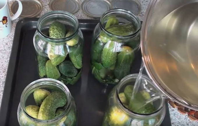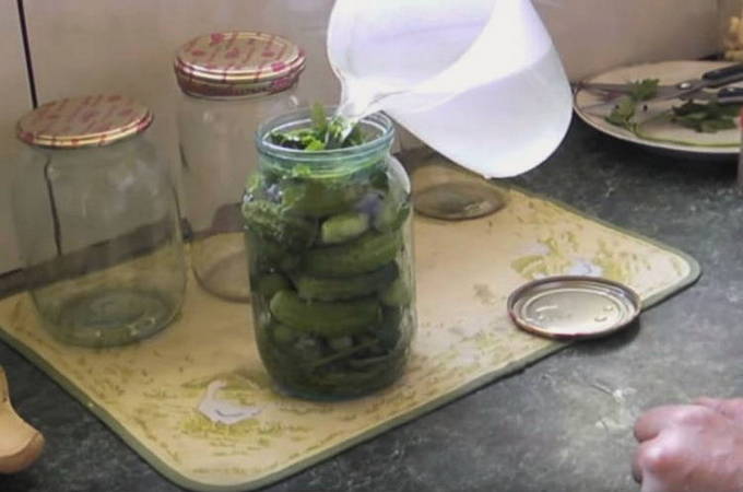 - We doen komkommers in een pot, maar probeer de container niet te strak te vullen. Vul met kokend water, dek af met een deksel en laat een half uur trekken.