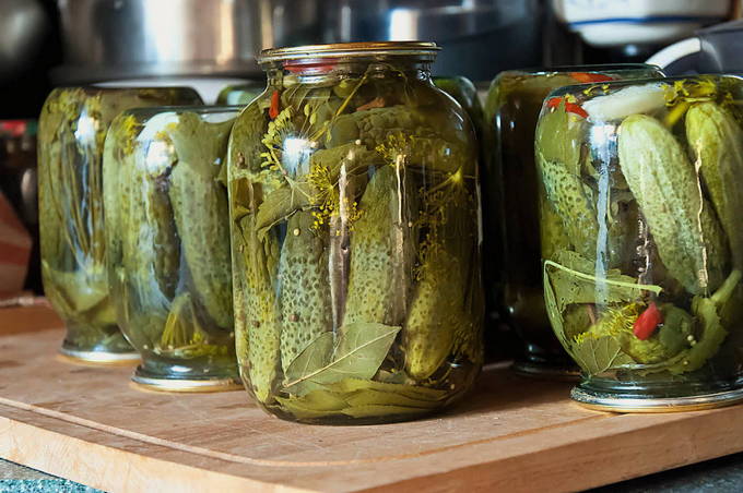 - Plaats in elke pot een dille-paraplu, een paar ongesneden knoflookteentjes, peperkorrels en krentenblaadjes, evenals mierikswortelgroenten en laurierblaadjes.