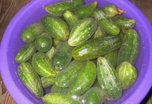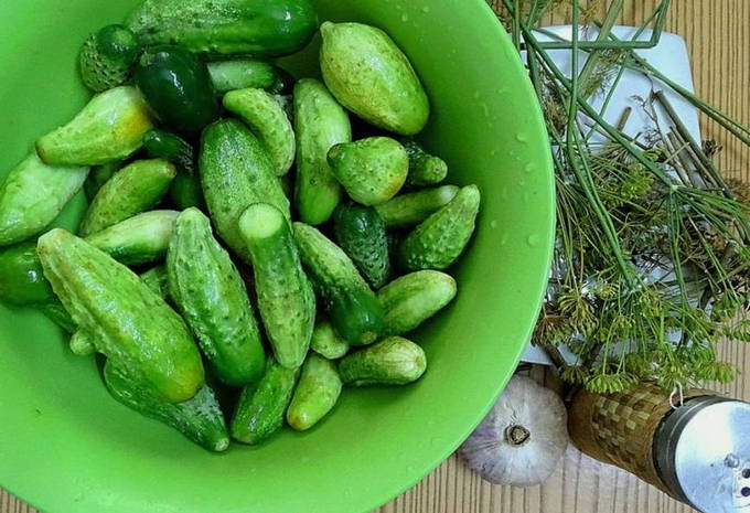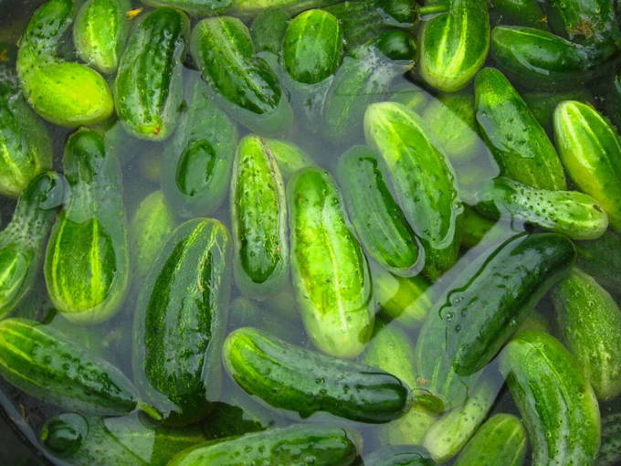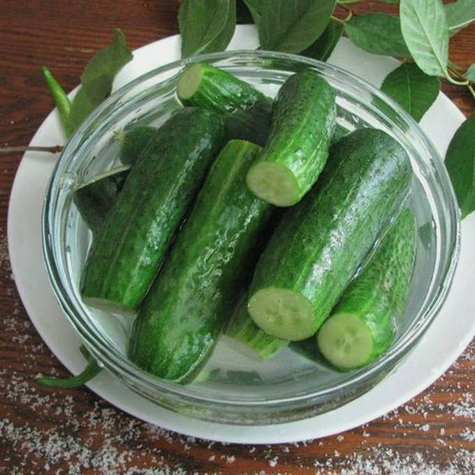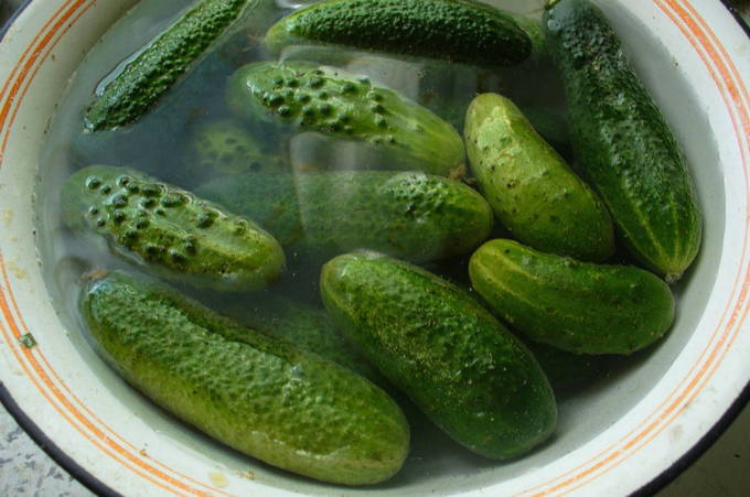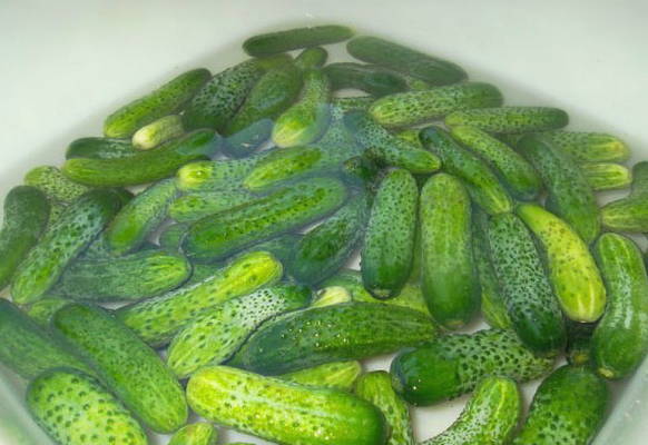 - We doen de komkommers in een bak met een geschikt volume en vullen deze enkele uren met water. Dit is nodig zodat de groenten na het bewaren geen overtollig vocht opnemen en de groenten in het bovenste gedeelte niet zonder marinade blijven.