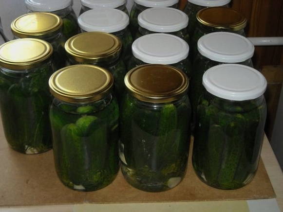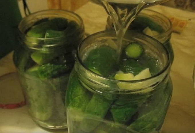 - Giet in een andere pan de benodigde hoeveelheid suiker, zout en citroenzuur in kokend water en houd het ongeveer 2 minuten in brand. Vul de komkommers met de resulterende marinade en sluit af met een gesteriliseerd deksel. We zetten de blikken ondersteboven, dekken af en wachten tot ze zijn afgekoeld. Ze kunnen bij elke temperatuur worden bewaard.