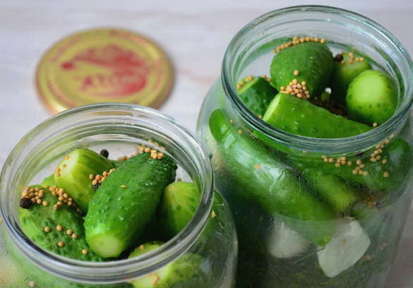 Snijd de uiteinden van de komkommers af en doe de groenten in potten, vul ze met kokend water en laat ze 10 minuten afgedekt met deksels staan. Daarna laten we het water weglopen en vullen het opnieuw met kokend water gedurende 10 minuten. Daarna verwijderen we het water weer en doen we de benodigde hoeveelheid citroenzuur in de potten en elk een eetlepel mosterdkorrels.