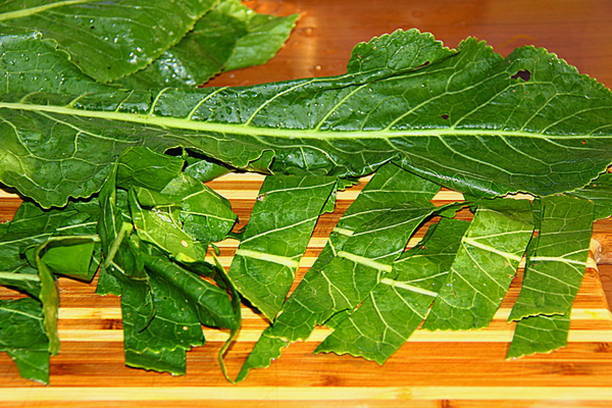 - In een gesteriliseerde pot doen we krenten- en kersenbladeren, evenals een mierikswortelblad, gehakte selderijtakjes en gehakte - grof - knoflook en - fijn - hete pepers.