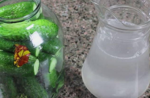 - Giet het komkommerwater af in een pan, voeg de benodigde hoeveelheid zout, suiker en citroenzuur toe, breng de marinade aan de kook, zet het vuur uit en laat het ongeveer 2 minuten trekken. Doe gehakte aspirinetabletten in een pot komkommer en vul met marinade.