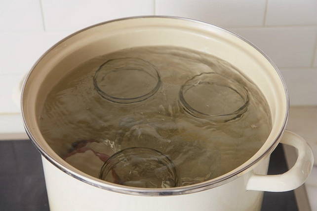 - Steriliseer potten met stoom, verwarm in de oven of magnetron op maximaal vermogen.