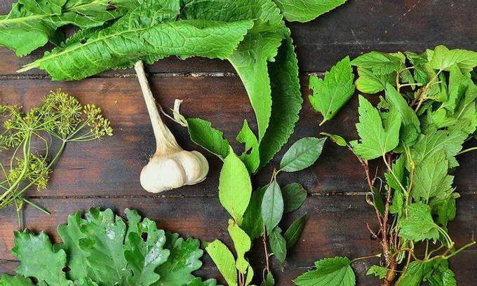 - In elke container om te rollen plaatsen we kersen- en bessenbladeren, dille, grof gehakte koriander en dragon, peperkorrels en stukjes paprika. Leg de komkommers er stevig op en giet alles met gekookt water en laat een half uur staan.
