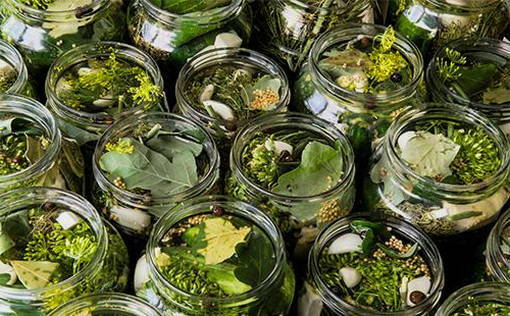 - In elke pot komkommers doen we hele teentjes knoflook, gesnipperde uien, kleine stukjes mierikswortelwortel en verschillende parasolletjes dille.
