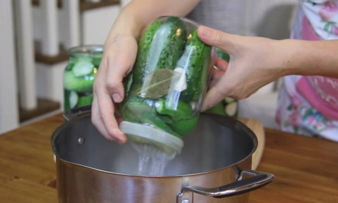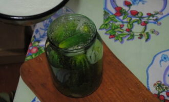 - Giet geleidelijk kokend water over de komkommers, zodat de potten tijdens het proces niet barsten. En we laten ze in deze vorm vijf minuten opwarmen.
