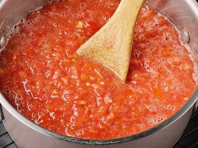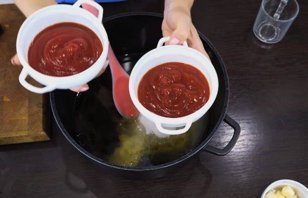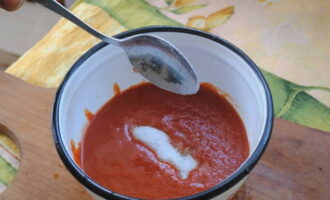 - Breng de tomatenpuree over in een pan en combineer met zout en kristalsuiker. Meng alles goed.