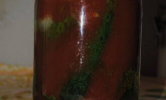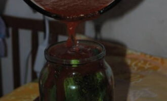 - We laten de gewassen dille op de bodem van de voorbereide potten zakken en gaan verder met de bereiding van de marinade. Combineer tomatenpuree met mosterd, azijn en losse ingrediënten. Roer alles goed door elkaar en verwarm op laag vuur.