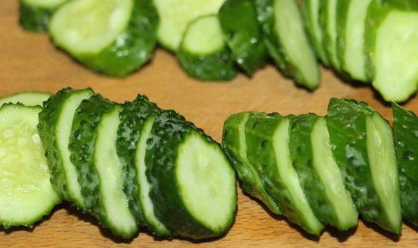 - We drogen de geweekte komkommers en snijden samen met de schil in kleine cirkels.