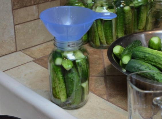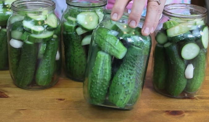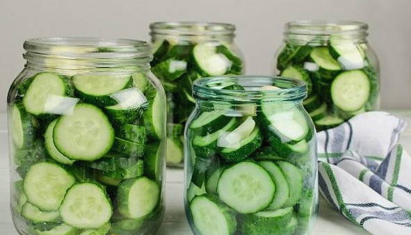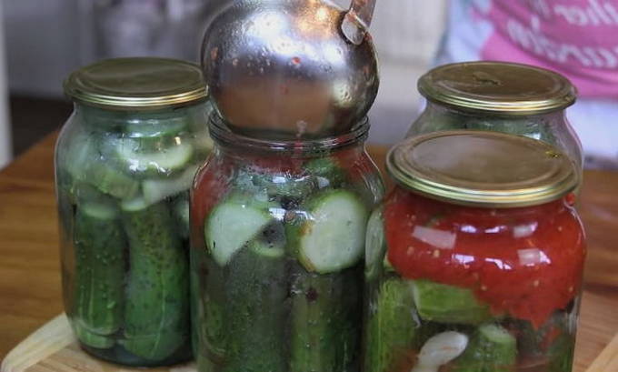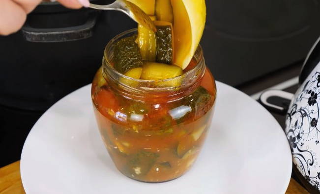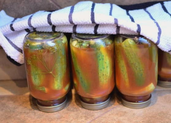 - Giet komkommers met hete marinade, rol de deksel op en laat ondersteboven afkoelen. Daarna sturen we de blikken voor opslag op een donkere, koele plaats.