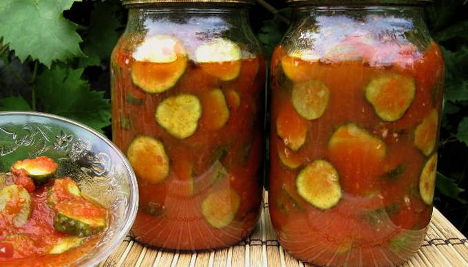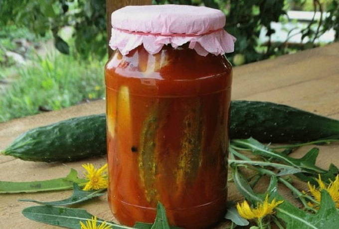 - Gesneden komkommers in tomatenpuree voor de winter