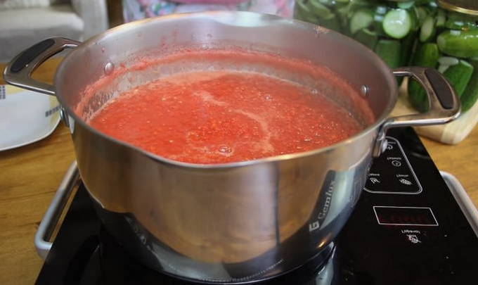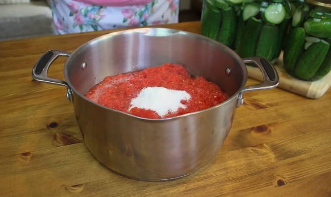 Terwijl de komkommers worden toegediend, bereidt u de marinade voor. Meng kristalsuiker, zout en kaneel door de tomatenpuree. Roer alles goed door en kook op laag vuur tot de kristallen van zout en suiker volledig zijn opgelost.