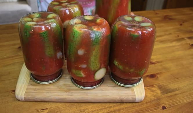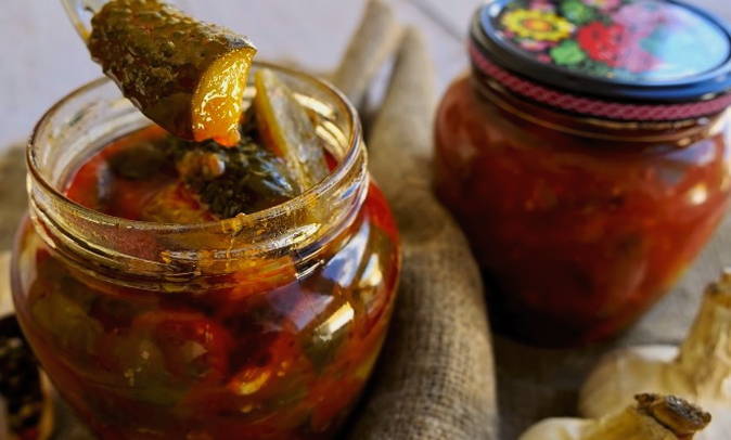 Zulke krokante komkommers in tomatensaus zijn nooit overbodig, zowel tijdens alledaagse als feestelijke maaltijden. De marinade met de toevoeging van pittige gemalen kaneel zal vooral interessant zijn.
