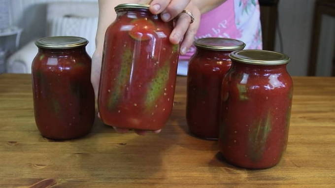 - Komkommers met tomatenpuree in literpotten zonder sterilisatie