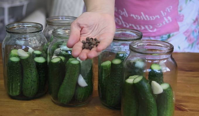 - Doe daarna de komkommers in de potten die zijn gewassen met frisdrank. De ingrediënten tonen de verhoudingen voor een liter blik. Voeg vervolgens laurierblaadjes, knoflook en piment toe.