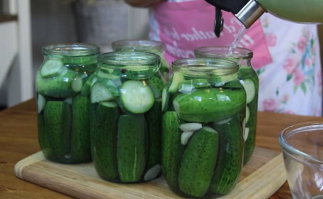 - Giet vervolgens de komkommers met secundair kokend water en dek af met voorbereide deksels. We raken de komkommerpotten gedurende 15 minuten niet aan.