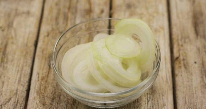 Voordat u de ui in ringen snijdt, verwijdert u de film ervan.