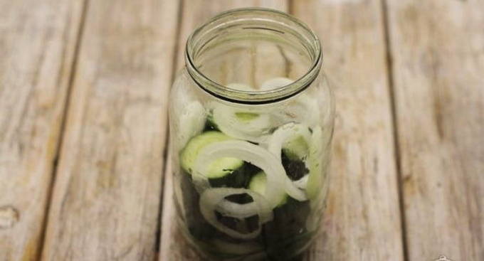- Doe de voorbereide komkommers en ui in een literpot, voeg ook piment en laurier toe.