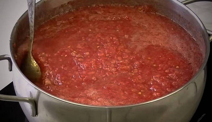 - Daarna snijden we ze in kleine plakjes en passeren ze door een vleesmolen, waardoor ze in dikke tomatenpuree worden.