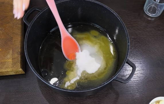 - Giet tegelijkertijd water en azijn in een pan, voeg suiker en plantaardige olie en zout toe. Meng alles goed en probeer maximale uniformiteit te bereiken.