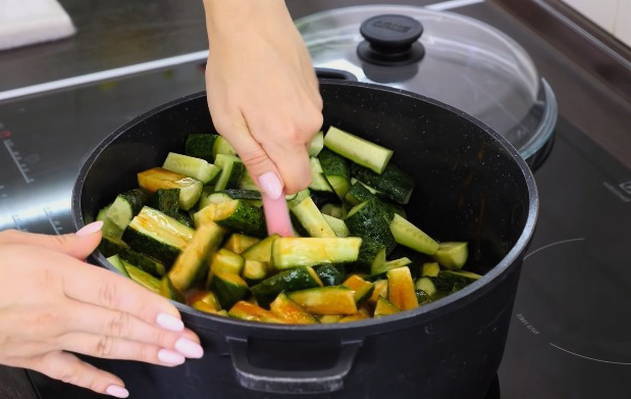 - We wassen de komkommers goed, drogen ze en snijden ze willekeurig in kleinere plakjes.Dan doen we ze meteen in een pannetje met tomatenpuree en zetten ze op een klein vuurtje. Kook eerst op hoog vuur, verminder het geleidelijk en kook onder een gesloten deksel gedurende 25-30 minuten.