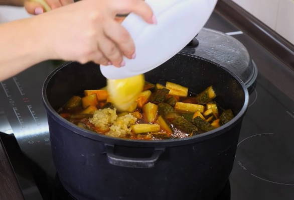 - Voeg knoflook toe aan een pan met kokende komkommers, meng goed en laat nog 10 minuten sudderen, altijd onder een gesloten deksel.