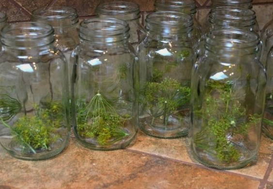 - Leg in de potten, na de dille, de komkommers zo strak mogelijk tegen elkaar en giet kokend water. Giet na 5-10 minuten het kokende water af en giet de afgewerkte marinade erin.