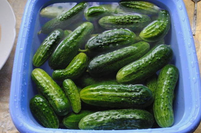 We wassen de komkommers en laten ze 2-3 uur in schoon koud water weken.