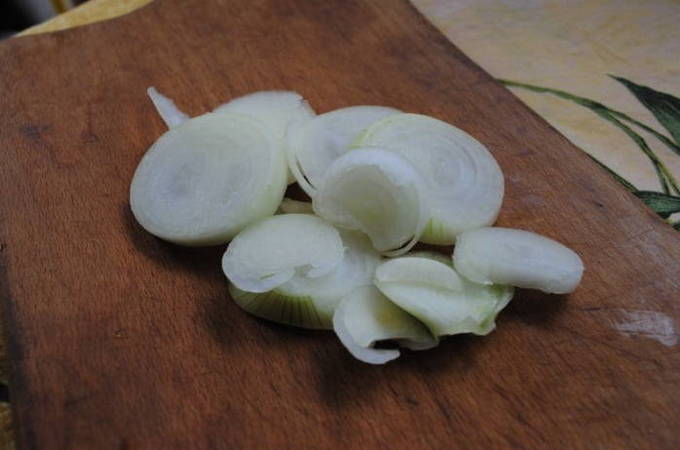 - Pel de ui en snij in halve ringen.