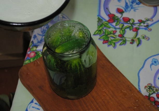 - Giet vervolgens de komkommers met secundair kokend water en dek af met voorbereide deksels. We raken de komkommerpotten gedurende 15 minuten niet aan.