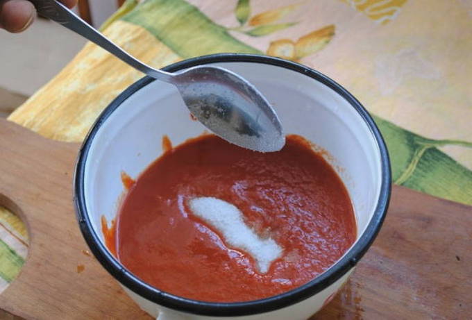- Breng de tomatenpuree over in een pan en combineer met zout en kristalsuiker. Meng alles goed.