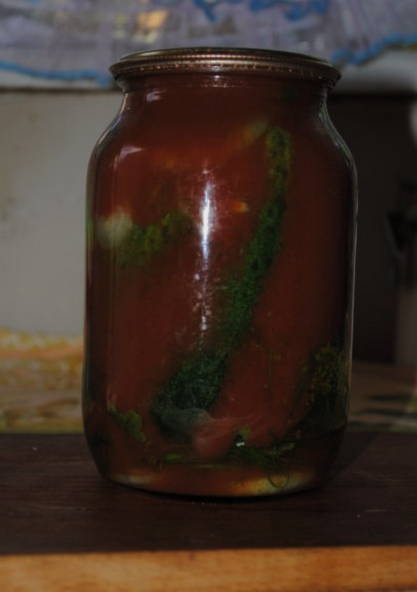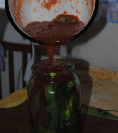 - Komkommers met tomatenpuree in literpotten zonder sterilisatie