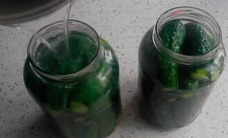 - We bedekken de potten met deksels. Giet na 7 minuten de pekel terug in de pan. Breng het opnieuw aan de kook en giet het terug in de potten. We herhalen de procedure nog een keer.