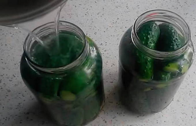 - We maken de potten en deksels schoon met zuiveringszout en spoelen grondig af. Daarna steriliseren we ze op een handige manier. Giet water in een pan en plaats de container op de brander. Aan de kook brengen. Giet kokend water over de komkommers. We doen ze in potten.Vervolgens sturen we verpletterde aspirinetabletten (één in elk blikje) en wodka.
