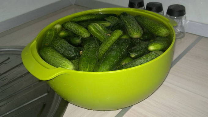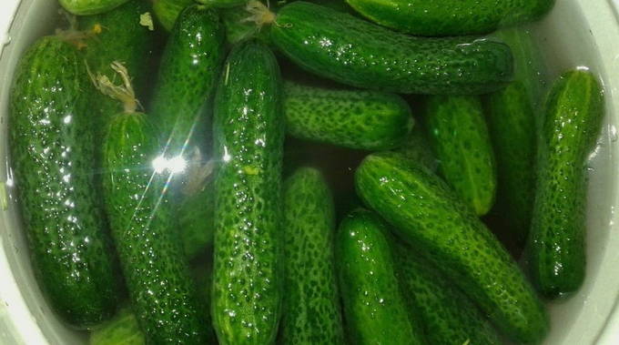 - We zetten een pan water op het fornuis. Terwijl de vloeistof kookt, spoel je de komkommers af. Daarna verbranden we de vruchten met kokend water en doen ze in een kom. Vul met koud water en laat 15 minuten staan.