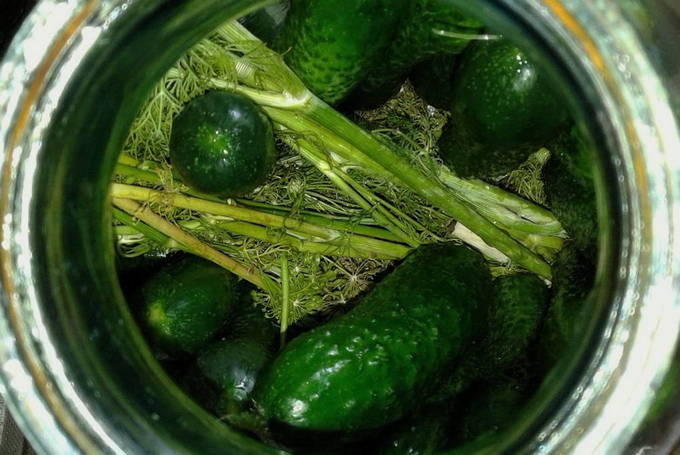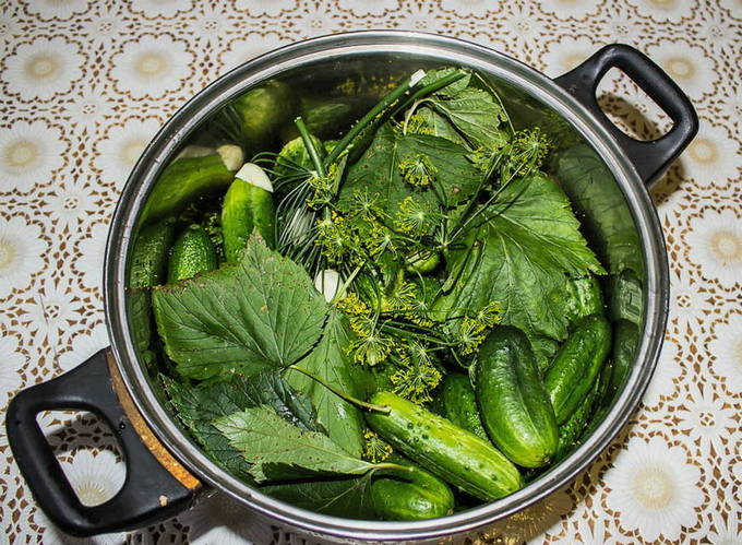 - We wassen de greens en laten ze drogen. We doen het in schone potten samen met knoflook en peper. Vervolgens sturen we komkommers.