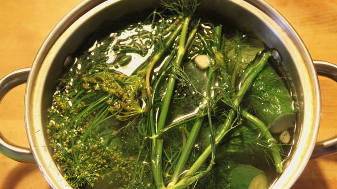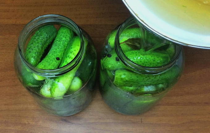 - We filteren de pekel door een fijne zeef en brengen aan de kook op het fornuis. Giet de pekel in de potten. We bedekken ze met deksels en draaien vast. We draaien de containers om en zetten ze in deze positie op de vloer. We verpakken de potten en laten ze een paar dagen afkoelen.