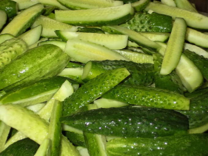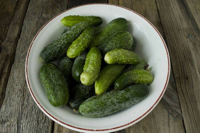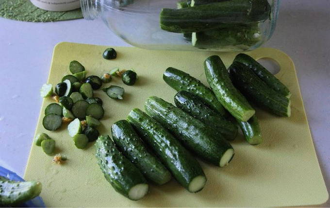 Voor het naaien zijn niet erg grote vruchten het meest geschikt. Het is niet nodig om azijn aan komkommers toe te voegen, zelfs niet in kleine hoeveelheden: wodka voorkomt dat de komkommers beschimmelen.