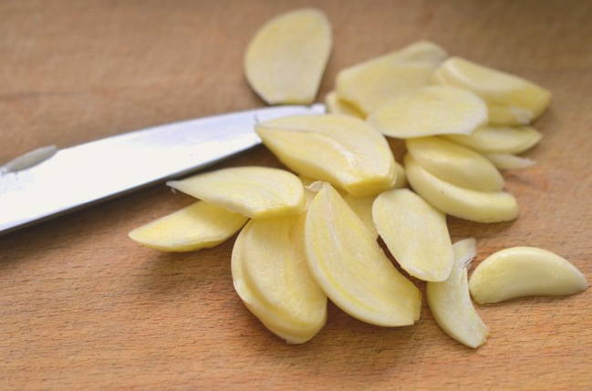 - Eerst spoelen we de potten en deksels af en steriliseren ze vervolgens op welke manier dan ook. Scheid het benodigde aantal teentjes knoflook van de hele krop. We pellen ze af. Je kunt de knoflook in partjes snijden of heel laten.