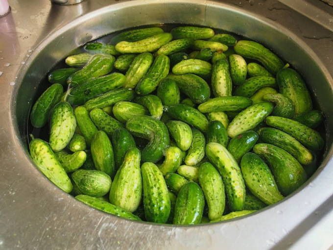 - Spoel de komkommers eerst grondig van vuil en zand. Daarna zetten we ze in een grote bak. Vul met koud water en laat een paar uur staan.