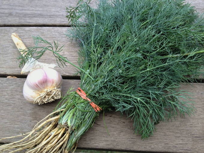 - We wassen de bladeren of wortels van mierikswortel samen met dille in koud water. We leggen ze op een papieren handdoek. Terwijl de mierikswortel en dille drogen, schil je de knoflook en snijd je het benodigde aantal teentjes in stukjes van willekeurige vorm.